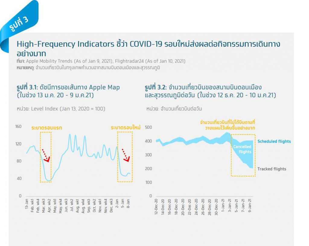 จากการระบาดของโควิด-19 ระลอกใหม่ และแนวทางการป้องกันของภาครัฐ ทำให้นักท่องเที่ยวจำนวนไม่น้อยเลือกที่จะเลื่อนตลอดจนยกเลิกการเดินทางท่องเที่ยวในช่วงเดือนมกราคมออกไปก่อน ดัชนีการขอเส้นทางจาก Apple Map ในรูปที่ 3.1 แสดงให้เห็นว่า ภายหลังจากวันหยุดยาวในช่วงปีใหม่ การขอเส้นทางจาก Apple Map ในช่วงวันที่ 1-8 ม.ค. 2021 หดตัวอย่างรุนแรงคล้ายคลึงกับช่วงที่มีการล๊อกดาวน์ในช่วงเดือนเมษายน 2020 แต่ไม่รุนแรงเท่า สำหรับการเดินทางทางอากาศก็มีการหดตัวเช่นเดียวกัน โดยเมื่อพิจารณาความต่างระหว่างจำนวนเที่ยวบินที่จะต้องบินตามตาราง กับจำนวนเที่ยวบินที่ทำการบินจริง จะเห็นจำนวนเที่ยวบินที่บินจริงอยู่ต่ำกว่าจำนวนเที่ยวบินตามตารางอย่างมากตั้งแต่มีการระบาดระลอกใหม่ โดยในวันที่ 9 มกราคม 2021 จำนวนเที่ยวบินที่บินจริงน้อยกว่าที่วางแผนไว้ถึง 50% (รูปที่ 3.2)