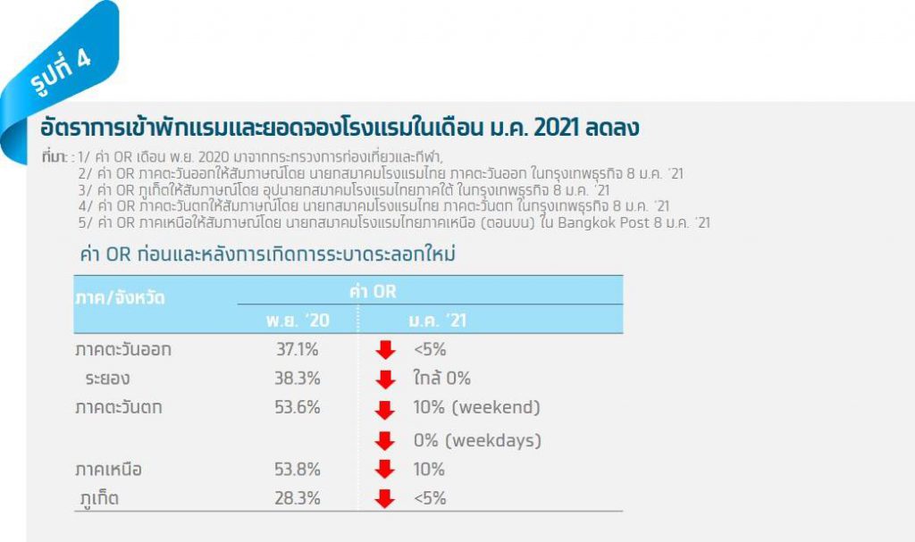 ผู้ประกอบการโรงแรมหลายรายได้ให้สัมภาษณ์ถึงตัวเลขอัตราการเข้าพักแรม (OR) และการจองโรงแรมที่ลดลงอย่างหนักในเดือนมกราคม 2021 หลังจากที่เพิ่งฟื้นตัวจากการล๊อกดาวน์ในช่วงเดือนเมษายน พฤษภาคมปีที่แล้วที่ค่า OR ค่อยๆฟื้นตัวจาก 5% มาแตะระดับ 34.8% ในเดือนพฤศจิกายน 2020 อย่างไรก็ดี การระบาดครั้งใหม่ทำให้ค่า OR ในจังหวัดท่องเที่ยวหลายจังหวัดกลับมาอยู่ในระดับน้อยกว่า 10% ใกล้เคียงกับช่วงล๊อกดาวน์ในปีที่แล้ว (รูปที่ 4) ซึ่งหลายฝ่ายหวังว่าพอคลายมาตรการควบคุมต่างๆ แล้วผู้คนจะกลับมาท่องเที่ยวเหมือนเดิมโดยเร็ว