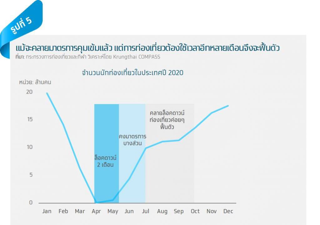 Krungthai COMPASS ประเมินว่า แม้การระบาดและมาตรการคุมเข้มของภาครัฐใช้เวลาเพียง 2 เดือน แต่กว่าการท่องเที่ยวในประเทศจะฟื้นตัวสู่ระดับที่เคยประเมินไว้อาจเป็นช่วงกลางไตรมาส 2 คิดเป็นมูลค่าความสูญเสียแก่ภาคท่องเที่ยวถึง 1.1 แสนล้านบาท จากตัวเลขนักท่องเที่ยวในประเทศที่จะหดตัว 22 ล้านคน