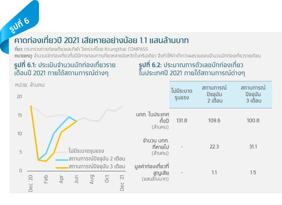 หากมาตรการควบคุมการระบาดยังคงมีความเข้มข้นในระดับปัจจุบันจนถึงเดือนกุมภาพันธ์ 2021 คาดว่าจะทำให้จำนวนนักท่องเที่ยวหดตัวอย่างรุนแรงในช่วงสองเดือนแรก ก่อนจะค่อยๆ ฟื้นตัวหลังผ่อนคลายมาตรการ และกลับมาอยู่ในระดับที่ไม่มีการระบาดรุนแรงในช่วงเดือนพฤษภาคม ทำให้จำนวนนักท่องเที่ยวในประเทศทั้งปี 2021 ลดลงจากที่เคยประมาณไว้จากข้อสมมุติที่ไม่มีการระบาดรุนแรงที่ 131.8 ล้านคนมาอยู่ที่ 109.6 ล้านคน (ฟื้นตัวจากปี 20 ที่มีเพียง 91 ล้านคน) คิดเป็นมูลค่าความสูญเสียต่อภาคท่องเที่ยวประมาณ 1.1 แสนล้านบาท อย่างไรก็ดี หากมีการบังคับใช้มาตรการควบคุม 3 เดือนจะทำให้จำนวนนักท่องเที่ยวฟื้นตัวช้ากว่าเดิม นักท่องเที่ยวในประเทศจะเหลือเพียง 100.8 ล้านคน คิดเป็นมูลค่า ความสูญเสียต่อการท่องเที่ยวกว่า 1.5 แสนล้านบาท แม้ในภาพรวมการท่องเที่ยวจะต้องใช้ระยะเวลาหลายเดือนในการฟื้นตัว แต่เราประเมินว่าการท่องเที่ยวในบางจังหวัดจะฟื้นตัวได้ก่อน