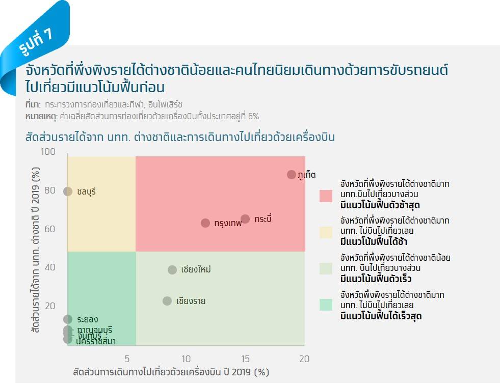 จากข้อสมมติข้างต้น เราจึงวิเคราะห์ว่า (รูปที่ 7) จังหวัดท่องเที่ยวที่สำคัญของ ไทยที่จะฟื้นตัวก่อน คือจังหวัดที่มีรายได้หลักจากนักท่องเที่ยวไทย และนักท่องเที่ยวมักเดินทางไปด้วยรถยนต์ อย่างเช่น จังหวัดระยอง จันทบุรี กาญจนบุรี นครราชสีมา ส่วนจังหวัดที่แม้นักท่องเที่ยวส่วนหนึ่งเดินทางด้วยเครื่องบิน แต่พึ่งพิงรายได้จากนักท่องเที่ยวต่างชาติไม่สูงนัก (ในที่นี้คือน้อยกว่า 50%) มีโอกาสที่จะฟื้นตัวตามมา ในขณะที่จังหวัดที่ฟื้นตัวได้ค่อนข้างช้าคือ จังหวัดที่รายได้หลักมาจากนักท่องเที่ยวต่างชาติอย่างชลบุรี ส่วนกลุ่มที่ฟื้นตัวได้ช้าที่สุดคือกลุ่มที่พึ่งพิงรายได้จากต่างชาติเป็นหลัก และนักท่องเที่ยวจำนวน มากต้องเดินทางไปด้วยเครื่องบิน อย่างเช่นจังหวัดกรุงเทพฯ กระบี่ ภูเก็ต เป็นต้น