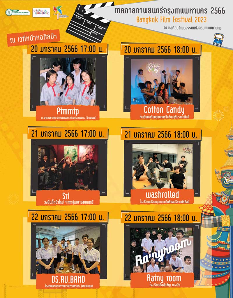 กทม.พร้อมแล้วเปิด “เทศกาลภาพยนตร์กรุงเทพมหานคร ประจำปี 2566” (Bangkok Film Festival) ขับเคลื่อน “กรุงเทพมหานคร” สู่มหานครสร้างสรรค์ ภายใต้นโยบายจัด 12 เดือน 12 เทศกาลตลอดปีทั่วกรุงเทพมหานคร ในแนวคิด “Colorful Bangkok” ซึ่งช่วงสุดสัปดาห์ 20-22 ม.ค. 2566 เตรียมตั้งวงเสวนาเข้มข้นจากนักสร้างภาพยนตร์และสารคดีแถวหน้าของไทย ประกาศรางวัลสารคดีสั้น Connecting Bangkok 2030 ปิดท้ายฉายหนังกลางแปลง 3 เรื่องที่ไปไกลระดับโลก สุริโยไท, ฉลาดเกมส์โกง และ Blue Again พร้อมสร้างสีสันความคึกคักในเทศกาลกับวงดนตรีเยาวชนที่กำลังมาแรงในกลุ่มวัยรุ่นรวม 6 วงดนตรี
