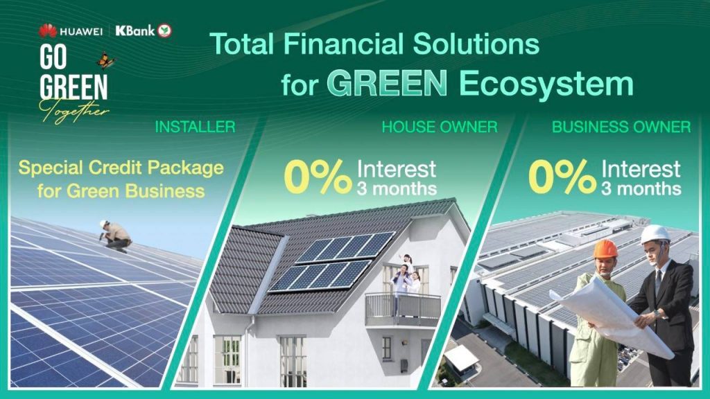 เจ้าของบ้านที่มีความต้องการติดตั้งระบบไฟฟ้าพลังงานแสงอาทิตย์ เพียงมายื่นขอสินเชื่อกับธนาคารกสิกรไทยผ่อนได้สูงสุด 30 ปี สำหรับเจ้าของธุรกิจโรงงานผ่อนได้สูงสุด 8 ปี ทั้งหมดฟรีดอกเบี้ 0% สำหรับ 3 เดือนแรก ได้รับการระบบไฟฟ้าพลังงานแสงอาทิตย์ที่ได้มาตรฐานระบบโลกโดยหัวเว่ยและทีมพันธมิตรในการติดตั้ง ดูแล และบำรุงรักษา