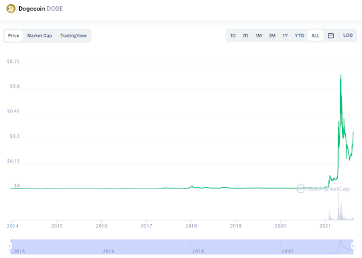 และในช่วงต้นปี 2021 นี้เอง Elon Musk เจ้าของ Tesla ชื่อดังมีการพูดถึง Dogecoin อยู่เรื่อย ๆ หลายรอบผ่านทาง Clubhouse และ Twitter ส่วนตัว ซึ่งเขาดูมีความชื่นชอบและเชื่อมั่นใน Dogecoin มากเป็นพิเศษ ทำให้ราคา Dogecoin นั้นพุ่งขึ้นสูงสุดในเดือน เมษายน 2021 ถึง 0.6848 ดอลลาร์ คิดเป็นเงินไทยประมาณ 22.30 บาทต่อ 1 Doge เลยทีเดียว แม้ในปัจจุบันราคาจะร่วงลงที่ 0.2037 ดอลลาร์แล้วก็ตาม แต่ Dogecoin ก็ยังคงเป็นเหรียญยอดนิยมอันดับที่ 7 ในตลาดคริปโทเคอร์เรนซีที่ยังคงน่าจับตามองตลอดเวลา