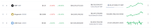โดยปัจจุบัน (17 สิงหาคม 2021) มีจำนวนเหรียญ Dogecoin หมุนเวียนในตลาดกว่า 130,895 ล้านเหรียญ มูลค่าตลาดรวม 43,067 ล้านดอลลาร์ ครองส่วนแบ่งตลาด 2.15% ติดอันดับที่ 7 ของตลาดคริปโทเคอร์เรนซี อ้างอิงจากเว็บไซต์ Coinmarketcap.com