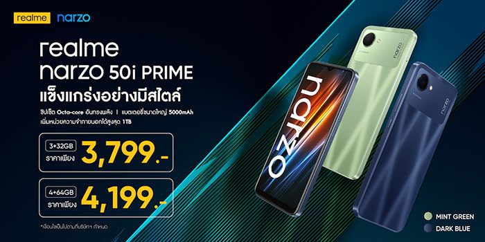 realme narzo 50i Prime มีให้เลือก 2 สี ทั้ง Mint Green และ Dark Blue นำเสนอ 2 สเปกทั้งรุ่น 3/32GB และรุ่น 4/64GB ในราคา 3,799 และ 4,199 บาทตามลำดับ โดยกำหนดวางจำหน่ายเฉพาะช่องทางออนไลน์เท่านั้น เริ่มจำหน่ายในวันที่ 23 สิงหาคมทั้งทาง Shopee และ Lazada พิเศษไปกว่านั้น! ในวันที่ 23 สิงหาคม – 31 สิงหาคม สามารถเป็นเจ้าของ realme narzo 50i Prime ในราคาคุ้มค่าที่สุดเพียง 2,999 บาทเมื่อใช้คูปองส่วนลดจากช่องทาง Shopee และราคาสุดคุ้มเพียง 3,499 บาทเมื่อใช้คูปองส่วนลดจากช่องทาง Lazada