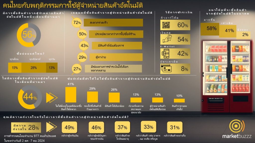 ผลจากการสำรวจพบว่าเหตุผลหลักในการซื้อสินค้าจากตู้จำหน่ายสินค้าอัตโนมัติ ได้แก่ ความสะดวกสบาย (72%) ประหยัดเวลา (50%) มีสินค้าพร้อมจำหน่าย (43%) และการมีช่องทางการชำระเงินที่หลากหลาย (27%)