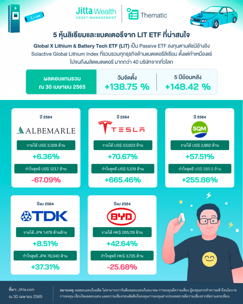 นี่คือ ข้อมูลเกี่ยวกับธีมลิเธียมและแบตเตอรีที่คุณควรรู้ก่อนจะตัดสินใจจัดพอร์ตลงทุนใน LIT พร้อมกับธีมอื่นๆ ในกองทุนส่วนบุคคล Thematic ผมจะพาคุณไปเจาะลึก 5 บริษัทที่มีสัดส่วนการลงทุนสูงที่สุดใน LIT เพื่อให้เห็นภาพอย่างชัดเจนยิ่งขึ้นว่า คุณกำลังลงทุนในหุ้นประเภทใดบ้าง