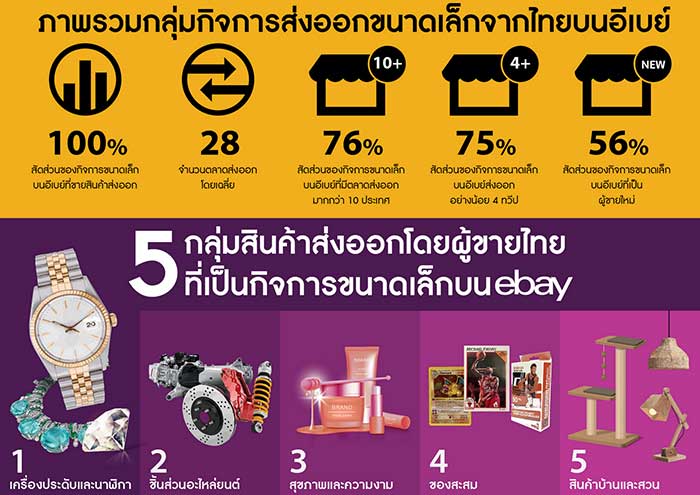 ประเด็นน่าสนใจข้อหนึ่งในรายงานฉบับนี้คือ ผู้ขายไทยที่ถือเป็นกิจการขนาดเล็กบนอีเบย์ ขายสินค้าส่งออกทั้ง 100% แสดงให้เห็นว่า แพลตฟอร์มอีเบย์เป็นช่องทางที่ช่วยขยายโอกาสให้ผู้ขายเข้าถึงผู้ซื้อจากทั่วทุกมุมโลก สันห์อมร วิชัยนิษฐ์ ผู้ขายสินค้าเครื่องประดับจิวเวลรี่บนอีเบย์ กล่าวว่า “อีเบย์ช่วยให้ธุรกิจครอบครัวเติบโตมากขึ้น และสร้างงานในชุมชน ต้องขอขอบคุณทีมงานอีเบย์ที่ให้การสนับสนุนเป็นอย่างดีมาตลอด”