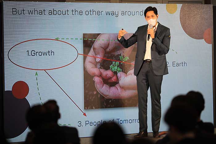 ดร. ณภัทร จาตุศรีพิทักษ์ กรรมการผู้จัดการสถาบันอนาคตไทยศึกษา กล่าวในห้วข้อ “ความยั่งยืน : กุญแจสำคัญในการพลิกฟื้นเศรษฐกิจไทยและการสร้างคุณค่ารูปแบบใหม่” ว่า วิกฤติโควิด 19 ส่งผลกระทบซ้ำเติมความเปราะบางของระบบเศรษฐกิจไทยที่มีปัญหาเรื้อรังมายาวนาน อีกทั้งเทรนด์โลกกำลังมุ่งหน้าสู่การสร้างมาตรฐานสากลของความยั่งยืน ส่วนตัวจึงมองว่า การฟื้นฟูและการพัฒนาไปสู่เศรษฐกิจสมัยใหม่นั้นต้องใช้แนวคิดการพัฒนาอย่างยั่งยืนอย่างจริงจัง ไม่ว่าจะเป็นการดึงเทคโนโลยีหรือนวัตกรรมเข้ามาเป็นส่วนหนึ่งของการสร้างมูลค่าเพิ่มและการตรวจสอบกิจกรรมทางเศรษฐกิจและสังคมของผู้เล่น สำคัญที่สุด ภาครัฐจำเป็นต้องมีบทบาทที่ชัดเจนยิ่งขึ้นในมิติของกฎกติกาเพื่อให้ทุกฝ่ายสามารถเติบโตไปด้วยกันได้อย่างยั่งยืน