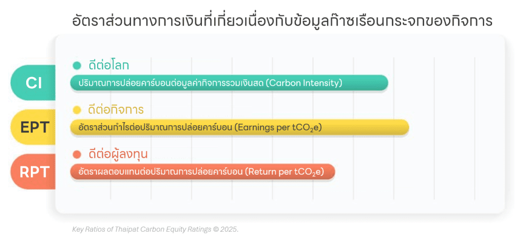 ตัวชี้วัดในมุมมอง ‘ดีต่อผู้ลงทุน’ ได้แก่ อัตราผลตอบแทนต่อปริมาณการปล่อยคาร์บอน (Return per tCO2e) มีหน่วยเป็นบาทต่อตันคาร์บอนไดออกไซด์เทียบเท่า