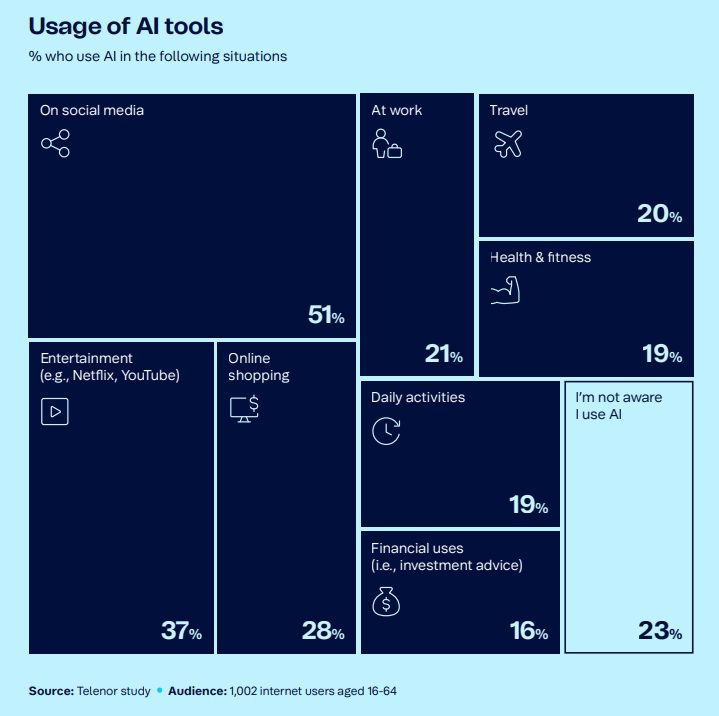 ความกระตือรือร้นต่อ AI ในประเทศไทยนั้นชัดเจน โดย 77% ของผู้ตอบแบบสอบถามใช้เครื่องมือ AI อยู่แล้ว ความบันเทิงเป็นพื้นที่หลัก โดยมากกว่าครึ่งใช้ AI สำหรับโซเชียลมีเดีย และเกือบ 40% มีส่วนร่วมกับ AI บนแพลตฟอร์มสตรีมมิ่งวิดีโอ ในขณะที่ 85% เชื่อว่า AI จะมีผลกระทบเชิงบวกต่อการศึกษาในประเทศไทย แต่ยังมีโอกาสที่ยังไม่ได้ใช้ประโยชน์อย่างมากในที่ทำงาน