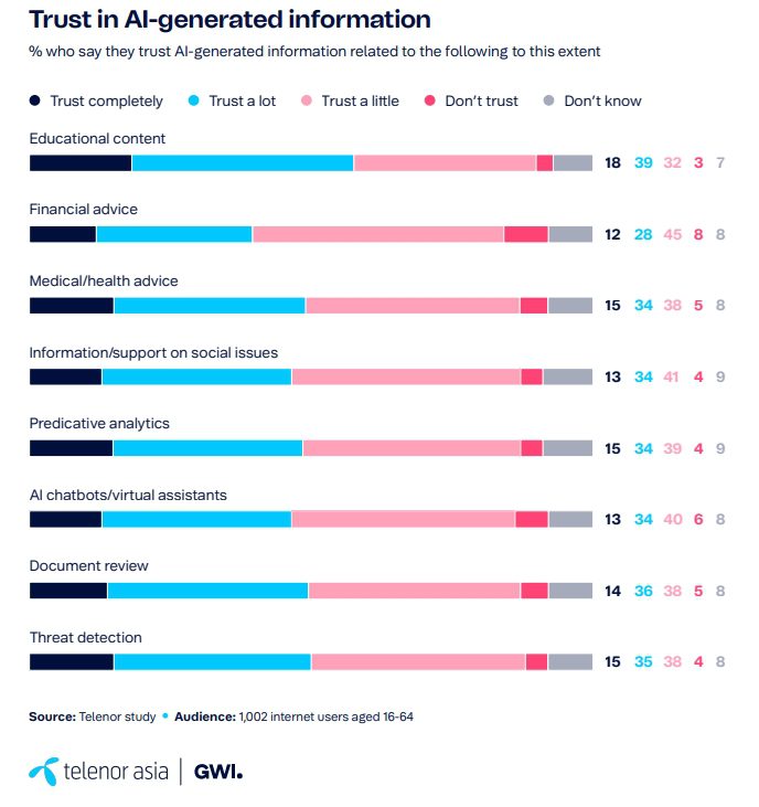 ความกลัวเกี่ยวกับอุปกรณ์ที่ผสานรวม AI ในประเทศไทยก็ยังน้อยกว่าในมาเลเซียและสิงคโปร์ และความไว้วางใจในข้อมูลที่สร้างโดย AI นั้นสูงกว่าในทุกด้านในประเทศไทย