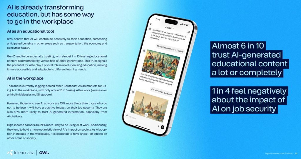 คนไทยให้ความไว้วางใจใน AI มากกว่าประเทศเพื่อนบ้านอย่างสิงคโปร์และมาเลเซีย และยังเป็นผู้นำในการใช้ชีวิตแบบดิจิทัล โดยใช้เวลาออนไลน์เฉลี่ยเกือบ 5 ชั่วโมงต่อวัน ซึ่งมากกว่าค่าเฉลี่ยของเอเชียตะวันออกเฉียงใต้ที่ 4 ชั่วโมง 35 นาที