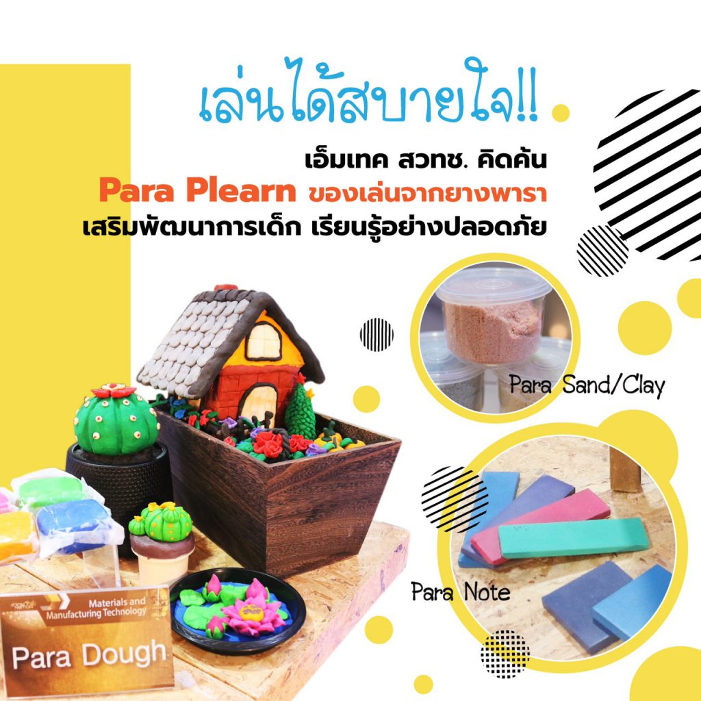 ดร.สุรพิชญ ลอยกุลนันท์ ผู้อำนวยการกลุ่มวิจัยนวัตกรรมการแปรรูปยาง ศูนย์เทคโนโลยีโลหะและวัสดุแห่งชาติ (เอ็มเทค) สำนักงานพัฒนาวิทยาศาสตร์และเทคโนโลยีแห่งชาติ (สวทช.) เปิดเผยว่า เมื่อเร็ว ๆ นี้ ภายในงานแถลงข่าวสรุปผลงาน สวทช. ประจำปี 2563 ภายใต้งาน NSTDA Beyond Limits: 3 Decades of Impacts (3 ทศวรรษ แห่งความต่อเนื่อง ความสำคัญและผลกระทบ) เอ็มเทค สวทช. เปิดตัวผลงานวิจัย Para Plearn ซึ่งเป็นนวัตกรรมของเล่นปลอดภัยที่ใช้ยางพาราเป็นวัสดุหลักในการผลิต โดยมีแนวคิดมาจากความต้องการนำยางพาราซึ่งถือเป็นพืชเศรษฐกิจสำคัญของประเทศมาเพิ่มมูลค่าด้วยการแปรรูปสู่ผลิตภัณฑ์ที่แปลกใหม่และมีความหลากหลายมากขึ้น
