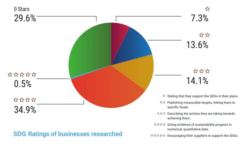 ในรายละเอียดของผลการวิจัยฉบับดังกล่าว ได้ประเมินธุรกิจที่ทำการสำรวจโดยแบ่งผลคะแนนออกเป็น 5 กลุ่ม ได้แก่ กลุ่มที่มีแผน (Plans) ในการดำเนินงานเพื่อสนับสนุน SDGs (1 ดาว) กลุ่มที่มีการให้คำมั่น (Commitments) โดยแสดงให้เห็นเป้าหมายขององค์กรสำหรับใช้วัดผลที่เชื่อมโยงกับ SDGs ที่เกี่ยวข้อง (2 ดาว) กลุ่มที่มีการระบุถึงรายละเอียดการดำเนินงาน (Actions) ในการที่จะบรรลุเป้าหมายดังกล่าว (3 ดาว) กลุ่มที่มีการเปิดเผยข้อมูลหลักฐานที่เป็นตัวเลขหรือในเชิงปริมาณซึ่งแสดงความก้าวหน้า (Progress) ของการดำเนินงาน (4 ดาว) และกลุ่มที่มีการผลักดันให้คู่ค้าหรือผู้ส่งมอบ (Suppliers) สนับสนุน SDGs (5 ดาว)