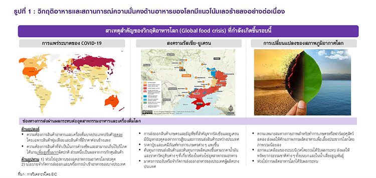 ศูนย์วิจัยเศรษฐกิจและธุรกิจ (EIC) ธนาคารไทยพาณิชย์ เปิดเผยว่า ปัจจุบันวิกฤติอาหารโลก (Global food crisis) มีแนวโน้มขยายวงกว้างและรุนแรงมากขึ้นเรื่อย ๆ ท่ามกลางความเสี่ยงด้านต่าง ๆ ในระบบนิเวศน์ที่เพิ่มสูงขึ้น ทั้งนี้จากการศึกษาพบว่าวิกฤติอาหารโลกที่เกิดขึ้นรอบนี้มีสาเหตุหลักมาจาก 3 ปัจจัย ได้แก่ 1) การแพร่ระบาดของโควิด-19 2) สงครามรัสเซีย-ยูเครน และ 3) การเปลี่ยนแปลงของสภาพภูมิอากาศโลก ปัจจัยดังกล่าวส่งผลให้เกิดการเปลี่ยนแปลงทั้งด้านอุปทานและอุปสงค์ ในตลาดอาหารโลกในวงกว้างอย่างมีนัยสำคัญ อีกทั้งยังส่งผลกระทบต่อห่วงโซ่การผลิตอาหารโลกตั้งแต่ระดับต้นน้ำจนถึงปลายน้ำ ในระยะสั้น