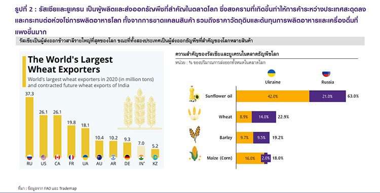 ในตลาดโลก ขณะที่ยูเครนก็เป็นผู้ส่งออกธัญพืชรายใหญ่อันดับ 4 ของโลก โดยมีสินค้าส่งออกสำคัญ อาทิ น้ำมันดอกทานตะวัน (42%) ข้าวโพด (16%) ข้าวบาร์เลย์ (10%) และข้าวสาลี (9%) เป็นต้น นอกจากนี้ การสู้รบที่เกิดขึ้นยังทำให้ไม่สามารถเพาะปลูกหรือเก็บเกี่ยวผลผลิตในบางพื้นที่ได้ ยิ่งไปกว่านั้น ราคาปุ๋ยและเคมีภัณฑ์ทางการเกษตรต่าง ๆ ยังปรับตัวสูงขึ้นมากอีกด้วย เนื่องจากรัสเซียเป็นผู้ส่งออกวัตถุดิบสำหรับทำปุ๋ยเคมีรายใหญ่ของโลก ทำให้ต้นทุนการผลิตสินค้าเกษตรและเกษตรแปรรูป รวมทั้งผลิตภัณฑ์อาหารต่าง ๆ ซึ่งเป็นปลายน้ำของห่วงโซ่การผลิตอุตสาหกรรมอาหารแพงขึ้นตามไปด้วย