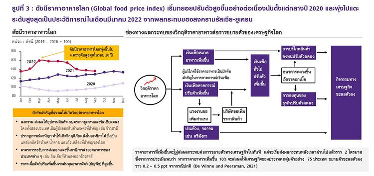 สถานการณ์ดังกล่าวได้ส่งผลให้เกิดปัญหาขาดแคลนอาหารขึ้นในหลายประเทศ โดยเฉพาะอย่างยิ่งในประเทศ ที่ไม่สามารถผลิตอาหารให้เพียงพอต่อความต้องการบริโภคภายในประเทศตนเอง และจำเป็นต้องพึ่งการนำเข้าอาหารจากต่างประเทศในสัดส่วนที่สูง อาทิ ประเทศในภูมิภาคตะวันออกกลางและทวีปแอฟริกา อีกทั้งยังกดดันให้ราคาอาหารในตลาดโลกปรับตัวสูงขึ้นอีกด้วย โดยจากข้อมูลพบว่าดัชนีราคาอาหารโลก (Global food price index) ขององค์การอาหารและการเกษตรแห่งสหประชาชาติ (Food and Agriculture Organization of the United Nations : FAO) (รูปที่ 3) ได้ทยอยปรับตัวสูงขึ้นอย่างต่อเนื่องนับตั้งแต่ช่วงกลางปี 2020 และได้พุ่งขึ้นไปแตะระดับ 159.7 ในเดือนมีนาคม 2022 หรือเพิ่มขึ้นราว 40%YOY ซึ่งนับเป็นระดับที่สูงที่สุดในรอบ 30 ปีอีกด้วย ซึ่งเป็นผลกระทบจากสงครามรัสเซีย-ยูเครน ที่ทำให้มีการปิดท่าเรือขนส่งสินค้าต่าง ๆ ของยูเครน สถานการณ์ดังกล่าวยิ่งเพิ่มแรงกดดันต่ออัตราเงินเฟ้อและค่าใช้จ่ายด้านอาหารของครัวเรือนทั่วโลก และส่งผลให้วิกฤติความมั่นคงด้านอาหารยิ่งทวีความรุนแรงมากขึ้นตามลำดับ
