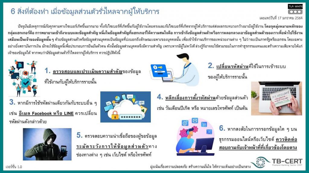 เตือนภัยไซเบอร์ TB-CERT แนะ 6 สิ่งควรทำ เมื่อข้อมูลส่วนตัวรั่วไหลจากผู้ให้บริการ