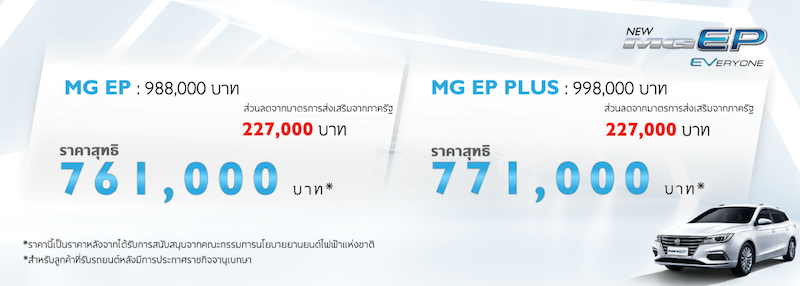 MG EP และ MG EP PLUS รถยนต์พลังงานไฟฟ้า 100% รูปแบบสเตชั่นแวกอน ที่เหมาะสำหรับทุกคน มีความโดดเด่นด้วยฟังก์ชั่น สิ่งอำนวยความสะดวก และเทคโนโลยีต่างๆ ที่เพียงพอต่อการใช้งาน ห้องโดยสารกว้างขวาง พื้นที่บรรทุกสัมภาระมีความจุมากถึง 1,456 ลิตร และมีแบตเตอรี่ขนาดใหญ่ที่วิ่งได้ไกลถึง 380 กิโลเมตรต่อการชาร์จเต็มหนึ่งครั้ง โดย MG EP และ MG EP PLUS เป็นรถอีกหนึ่งรุ่น ที่เข้าร่วมนโยบายสนับสนุนรถยนต์พลังงานไฟฟ้าของภาครัฐ ทำให้ราคาจำหน่ายใหม่เป็นดังนี้