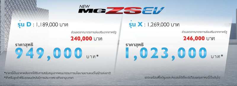 บริษัท เอสเอไอซี มอเตอร์ – ซีพี จำกัด และ บริษัท เอ็มจี เซลส์ (ประเทศไทย) จำกัด ผู้ผลิตและผู้จำหน่ายรถยนต์เอ็มจีในประเทศไทย ประกาศราคาจำหน่ายอย่างเป็นทางการของ NEW MG ZS EV รถยนต์พลังงานไฟฟ้า 100% รุ่นล่าสุด ราคาเริ่มต้น 949,000 บาท