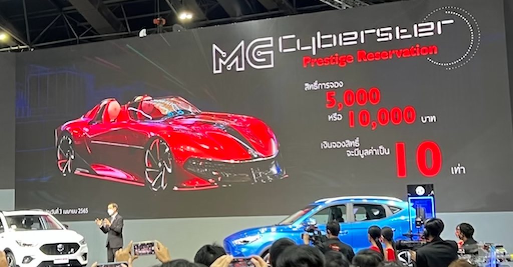 เมื่อปลายปีที่ผ่านมา เอ็มจีได้เผยโฉมรถสปอร์ตโรดสเตอร์ MG Cyberster ซึ่งเป็นรถยนต์ต้นแบบพลังงานไฟฟ้า 100% ซึ่งมีความโดดเด่นอยู่ที่การออกแบบสไตล์เดียวกับ MGB Roadster รถสปอร์ตในตำนานของเอ็มจี และมีการออกแบบห้องโดยสารในสไตล์อีสปอร์ต อีกทั้งยังมีการติดตั้งแบตเตอรี่ประสิทธิภาพสูง วิ่งได้สูงสุด 800 กิโลเมตรต่อชั่วโมง พร้อมมอเตอร์ไฟฟ้ากำลังสูงที่ให้อัตราเร่ง 0 – 100 กิโลเมตรต่อชั่วโมง เพียง 3 วินาที