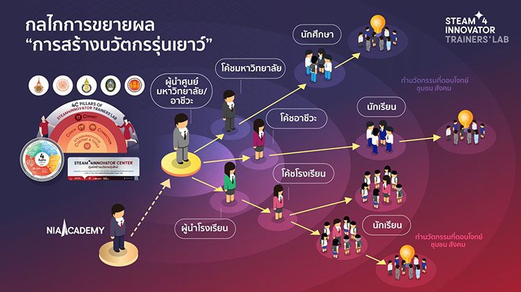 นอกจากนี้ NIA ยังให้ความสำคัญกับการสร้าง “นวัตกร” หรือผู้เชื่อมโลกแห่งองค์ความรู้กับการสร้างธุรกิจ ด้วยการใส่กลไก Groom (พัฒนา) Grant (ให้ทุน) Growth (เร่งการเติบโต) แล้ว การสร้างเครือข่าย “ผู้สร้างนวัตกร” หรือ “โค้ชนวัตกร” ผู้ที่จะขับเคลื่อนให้ระบบนวัตกรรมหมุนไปได้อย่างมีประสิทธิภาพด้วยอัตราการขยายผลเป็นเท่าทวีคูณ ทั้งนี้ ที่ผ่านมา NIA ได้ร่วมกับทั้ง 5 สถาบันการศึกษา ผลิตครู/อาจารย์ที่เป็นเครือข่าย ‘ผู้สร้างนวัตกร’ จำนวน 394 คน ผ่านโครงการ “STEAM4INNOVATOR Trainers’ Lab
