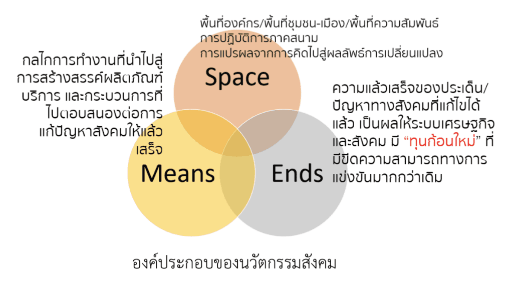 (1) วิถีทาง (Means) ซึ่งเป็นกลไกการทำงานที่นำไปสู่การสร้างสรรค์ผลิตภัณฑ์ บริการ และกระบวนการที่ไปตอบสนองต่อการแก้ปัญหาสังคมให้แล้วเสร็จ