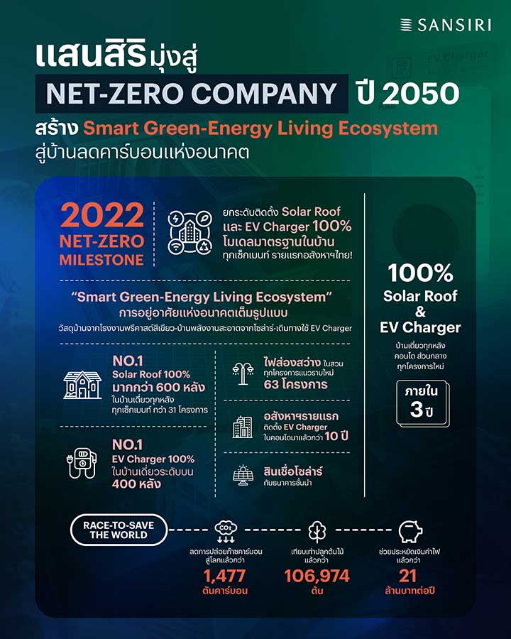 ในปีนี้ แสนสิริ เดินหน้ารุกเป้าพันธกิจ Net-Zero อย่างเป็นรูปธรรมต่อเนื่อง โดยเป็นอสังหาฯรายแรกในประเทศไทยที่สร้าง “Smart Green-Energy Living Ecosystem” การอยู่อาศัยแห่งอนาคตเต็มรูปแบบที่ลดการปล่อยก๊าซคาร์บอนสู่สิ่งแวดล้อมโลก ซึ่งลูกบ้านแสนสิริ มีส่วนร่วมช่วยลดการปล่อยก๊าซคาร์บอน จากการซื้อบ้านแสนสิริทุกโครงการใหม่แล้วกว่า 31 โครงการในปีนี้ จากต้นทางจนถึงปลายทางที่ใช้พลังงานสะอาดภายในบ้าน เริ่มต้นจากวัสดุบ้านที่ผลิตจากโรงงานพรีคาสต์สีเขียวของแสนสิริ ซึ่งเป็นโรงงานสีเขียวแห่งแรกและแห่งเดียวในประเทศไทยที่แทบจะมี Waste เป็นศูนย์ บ้านพลังงานสะอาดจากโซล่าร์ ติดตั้ง Solar Roof 100% ภายใต้ความร่วมมือกับพันธมิตร ไอออน เอนเนอร์ยี่ เพื่อใช้พลังงานสะอาดในการใช้ชีวิตประจำวัน ตลอดจน ติดตั้ง EV Charger สำหรับรถยนต์ไฟฟ้าพลังงานสะอาดในการเดินทางพร้อมยกระดับติดตั้งทั้ง Solar Roof และ EV Charger 100% ให้เป็นโมเดลมาตรฐานในทุกโครงการใหม่ของบ้านทุกรูปแบบ ทุกระดับเซ็กเม้นท์ ซึ่งแสนสิริ ยังเป็นอสังหาฯไทยรายแรก