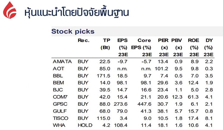 “คาดการณ์เป้าหมายดัชนี SET Index ปี 2566 ที่ 1,820 จุด และกำไรบริษัทจดทะเบียนโดยรวมที่ 109 บาทต่อหุ้น โดยเม็ดเงินฟันด์โฟลว์ต่างชาติคาดว่าจะยังไหลเข้ามาลงทุนมากขึ้น ค่าเงินบาทยังคาดว่าจะแข็งค่าต่อเนื่อง สะท้อนผ่านภาพในปัจจุบันที่เม็ดเงินต่างชาติเข้ามาลงทุนในหุ้นไทยและตราสารหนี้เพียง 20% เทียบยอดขายสุทธิในช่วง 5-7 ปีที่ผ่านมา ที่เงินไหลออกไปมาก”