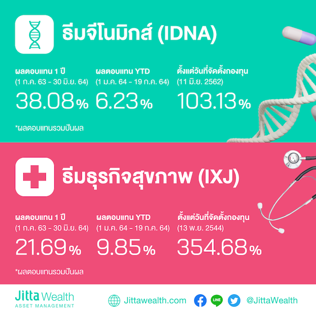 ทั้งนี้ เพื่อเป็นการกระจายความเสี่ยงด้วยต้นทุนที่ต่ำ บลจ. จิตตะ เวลธ์ จำกัด จึงแนะนำการลงทุนในหุ้นกลุ่มธุรกิจวัคซีนและสุขภาพที่จะมาปฏิวัติแวดวงการแพทย์ทั่วโลก ผ่าน ETF (Exchange Traded Fund) ที่ได้คัดสรรมาให้แล้ว นั่นคือ iShares Genomics Immunology and Healthcare ETF (IDNA) และ iShares Global Healthcare ETF (IXJ)