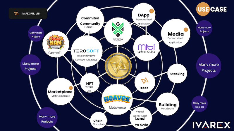โดยระบบนิเวศธุรกิจที่ 4 บริษัทพัฒนาและให้บริการลูกค้าองค์กรที่ต้องการพาธุรกิจเข้าสู่ Web 3 จะร้อยเชื่อมด้วยสกุลเงินของตัวเองคือ Iva Coin ที่จะเป็นโทเคนในระบบนิเวศ ซึ่ง Iva coin ถูกออกแบบมาให้เป็นโทเคนใช้ทั้งในโลกปัจจุบันและในโลกเมตาเวิร์ส ซึ่ง Ivarex มีเมตาเวิร์สชื่อ HEAVEX: The Metaverse รวมถึงเมตาเวิร์สพร้อมใช้ (Ready Metaverse) บริการสร้าง metaverse ให้กับธุรกิจที่ต้องการมีเมตาเวิร์สของตัวเอง ซึ่งผู้ให้บริการสร้างเวิร์สจะนำทัพโดย Terosoft ตามด้วย Ivarex