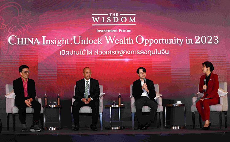 งานสัมมนา THE WISDOM Investment Forum : China Insight Unlock Wealth Opportunity in 2023 โดย ธนาคารกสิกรไทย เชิญนักเศรษฐศาสตร์และผู้เชี่ยวชาญด้านเศรษฐกิจการลงทุน ร่วมวิเคราะห์สัญญาณเศรษฐกิจทั่วโลกจากเหตุวิกฤติธนาคารซิลิคอน วัลเลย์ แบงก์ (SVB) จนลามมาสู่ธนาคารเครดิต สวิส (Credit Suisse) สะเทือนเสถียรภาพระบบเศรษฐกิจของสหรัฐฯ และยุโรป ในขณะที่การเติบโตทางเศรษฐกิจของจีนพุ่งสูงขึ้นถึง 5% ด้วยปัจจัยหลักจากความชัดเจนของทั้งนโยบายการเมืองและแผนการกระตุ้นเศรษฐกิจ ที่พร้อมรับการเปิดประเทศเต็มรูปแบบ ส่งผลดีกับเศรษฐกิจไทยทั้งด้านการท่องเที่ยวซึ่งคาดว่าในปีนี้จะมีนักท่องเที่ยวชาวจีนจำนวนกว่า 4.65 ล้านคนเดินทางเข้ามาไทย พร้อมดันยอดส่งออกในฐานะประเทศคู่ค้าอันดับสองรองจากสหรัฐฯ ด้วยมูลค่ารวมกว่า 34,389 ล้านดอลลาร์ แนะจับตาโอกาสลงทุนใน 3 อุตสาหกรรมหลักที่จีนกำลังให้ความสำคัญ ได้แก่ กลุ่มเทคโนโลยีชั้นสูง (Deep Tech) กลุ่มอี-คอมเมิร์ซ และกลุ่มอุปโภคบริโภค
