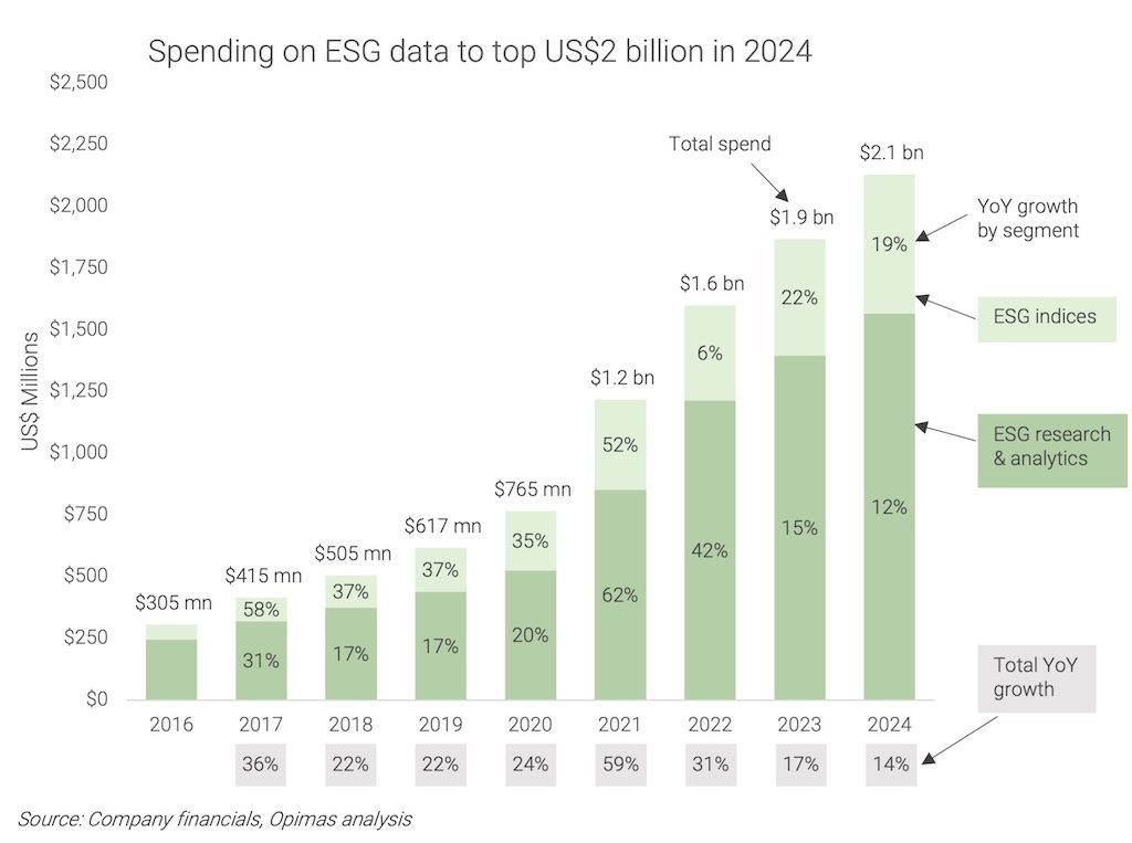 ตัวเลขการสำรวจของออพิมัส ที่ปรึกษาด้านการจัดการลงทุนในตลาดทุนทั่วโลก ระบุว่า ขนาดของตลาดข้อมูล ESG (Environmental, Social and Governance) จะมีมูลค่าเกิน 2 พันล้านเหรียญในปีนี้ จากที่เพิ่งทำสถิติที่ระดับ 1 พันล้านเหรียญ ในปี ค.ศ. 2021 หรือเมื่อสามปีที่แล้ว