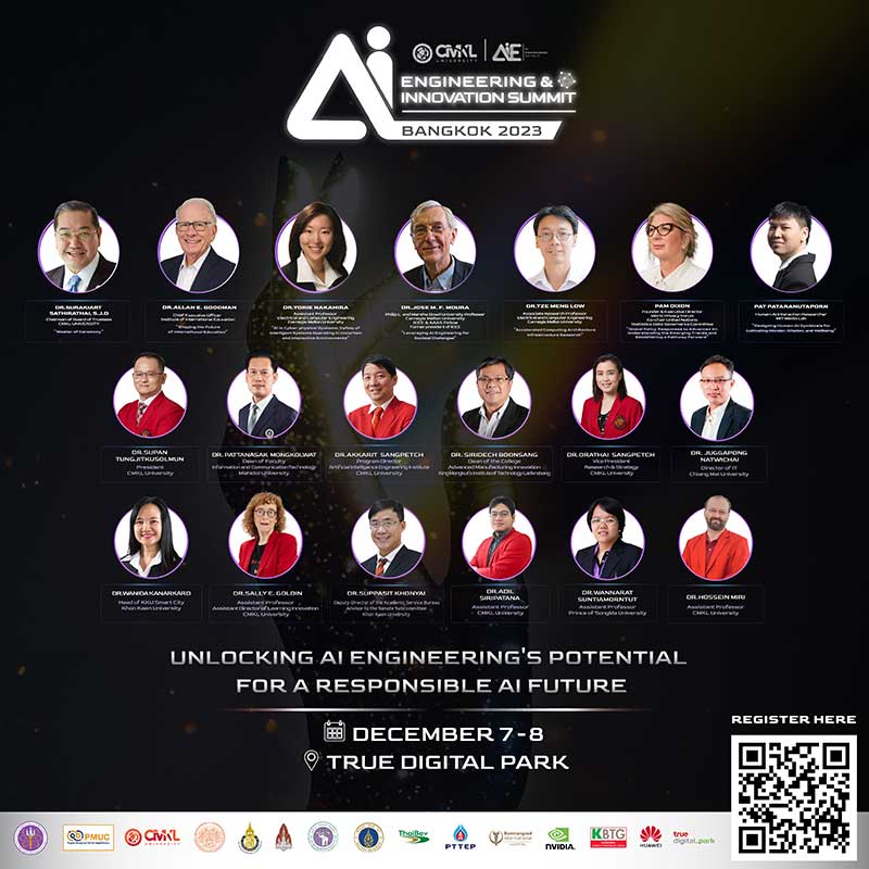 ครั้งแรกแห่งการพบกันครั้งยิ่งใหญ่ของผู้นำด้าน AI Engineering & Innovation จากสหรัฐอเมริกา และ คณะอาจารย์ ร่วมกับภาครัฐและเอกชน ชั้นนำของประเทศไทย เพื่อหารือ แลกเปลี่ยนองค์ความรู้และประสบการณ์ด้านนวัตกรรมด้าน AI มากมายเราขอเชิญทุกคนมาร่วมกันพบกับเหล่าผู้เชี่ยวชาญผู้มีความรู้ความสามารถด้านปัญญาประดิษฐ์ (AI) และวิศวะคอมพิวเตอร์ รวมถึงผู้นำทางด้านอุตสาหกรรมปัญญาประดิษฐ์จากสถาบันชั้นนำต่าง ๆ ที่จะมามอบความรู้ และพูดคุยในประเด็นที่ล้ำสมัยเกี่ยวกับ AI