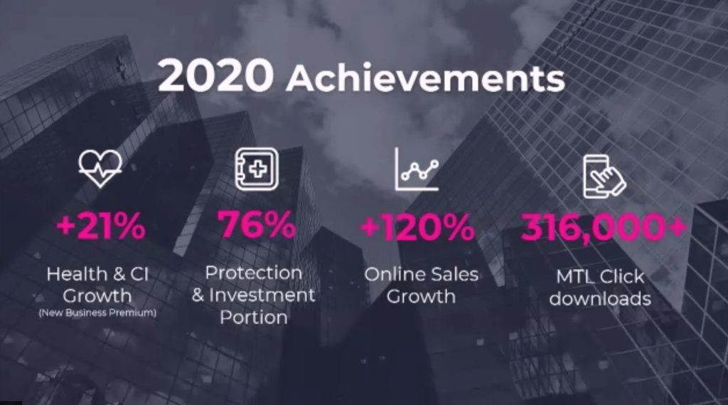 ผลการดำเนินงานของเมืองไทยประกันชีวิต ในปี 2563 มีอัตราการเติบโตของเบี้ยประกันภัย รับใหม่สำหรับผลิตภัณฑ์ประกันชีวิตประเภทสัญญาเพิ่มเติมการประกันสุขภาพและโรคร้ายแรง (Health & CI) อยู่ที่ 21% มีสัดส่วนการขายแบบประกันชีวิตประเภทคุ้มครองชีวิตและประกันชีวิตควบการลงทุน (Protection and Investment Linked Product Portion) สูงถึง 76% ขณะเดียวกันมีผลงานจากช่องทางการขายผ่าน Online Sales เติบโต 120% เมื่อเทียบกับปี 2562