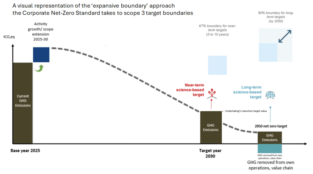 จึงเป็นเหตุให้ในมาตรฐาน Corporate Net Zero ของ SBTi ที่ประกาศใช้เมื่อปี ค.ศ. 2024 กำหนดให้กิจการที่มีสัดส่วนมลอากาศในขอบข่ายที่ 3 เกินกว่า 40% ของปริมาณมลอากาศที่ปล่อยทั้งหมด จะต้องตั้งเป้าหมายระยะใกล้ (5-10 ปี) สำหรับการลดมลอากาศลงให้ได้สองในสาม (67%) ของปริมาณมลอากาศที่ปล่อยในขอบข่ายที่ 3 และสอดคล้องกับกรอบเพดานอุณหภูมิไม่เกิน 2 °C เป็นอย่างน้อย ขณะที่การตั้งเป้าหมายระยะยาว (ปี ค.ศ. 2050) ต้องครอบคลุมการลดมลอากาศที่ปล่อยในขอบข่ายที่ 3 ให้ได้ 90% และสอดคล้องกับกรอบเพดานอุณหภูมิไม่เกิน 1.5 °C
