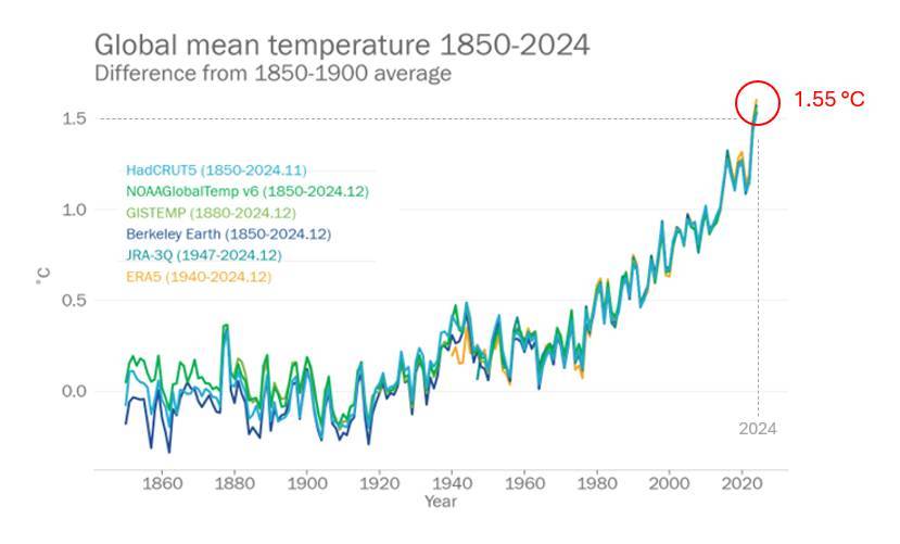 จากข้อมูลสภาพภูมิอากาศซึ่งเก็บจากแหล่งที่น่าเชื่อถือ 6 แหล่ง พบว่า ปี ค.ศ. 2024 อุณหภูมิเฉลี่ยผิวโลกได้เพิ่มสูงขึ้นอยู่ที่ 1.55 °C (± 0.13 °C) เกินกว่าระดับอุณหภูมิยุคก่อนอุตสาหกรรมเป็นปีแรก และเป็นปีที่ร้อนที่สุดในประวัติศาสตร์โลก