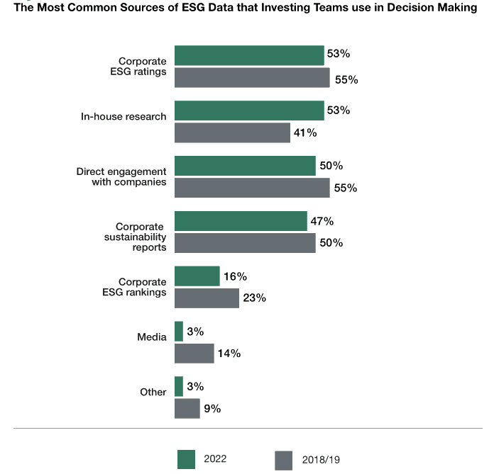 ในรายงาน Rate the Raters 2023: ESG Ratings at a Crossroads ที่จัดทำโดย SustainAbility Institute ระบุว่า แหล่งข้อมูล ESG จำนวน 6 แหล่ง ที่นิยมใช้ในการตัดสินใจลงทุน เมื่อเปรียบเทียบผลสำรวจระหว่างปี ค.ศ. 2018/19 กับ ค.ศ. 2022 มีแหล่งข้อมูลเดียว คือ In-house Research ที่มีอัตราเพิ่มขึ้นจาก 41% เป็น 53% ขณะที่การใช้ข้อมูลจากแหล่งอื่นอีก 5 แหล่ง มีอัตราลดลงทั้งหมด