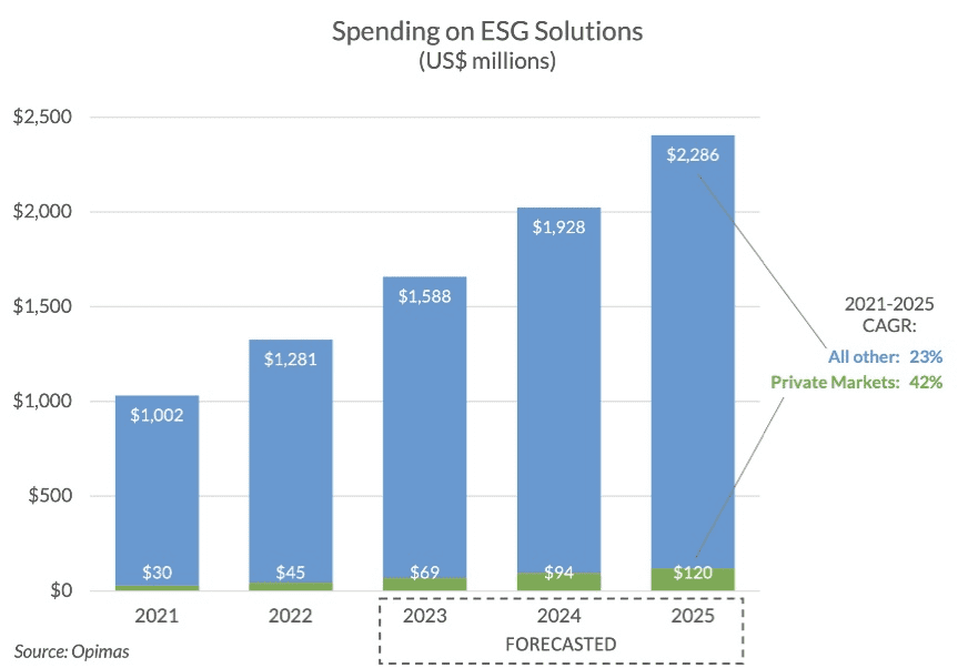 แม้ขนาดตลาดข้อมูล ESG ของบริษัทนอกตลาด (Private Markets) หรือบริษัทเอกชนที่มิได้จดทะเบียนในตลาดหลักทรัพย์ จะยังมีขนาดเล็ก โดยมีมูลค่าอยู่ที่ 45 ล้านเหรียญ ในปี พ.ศ. 2565 แต่ออพิมัสคาดการณ์ว่า จะมีอัตราการเติบโตเฉลี่ย (CAGR) ในช่วงห้าปี (พ.ศ. 2564-2568) สูงถึงร้อยละ 42 ต่อปี