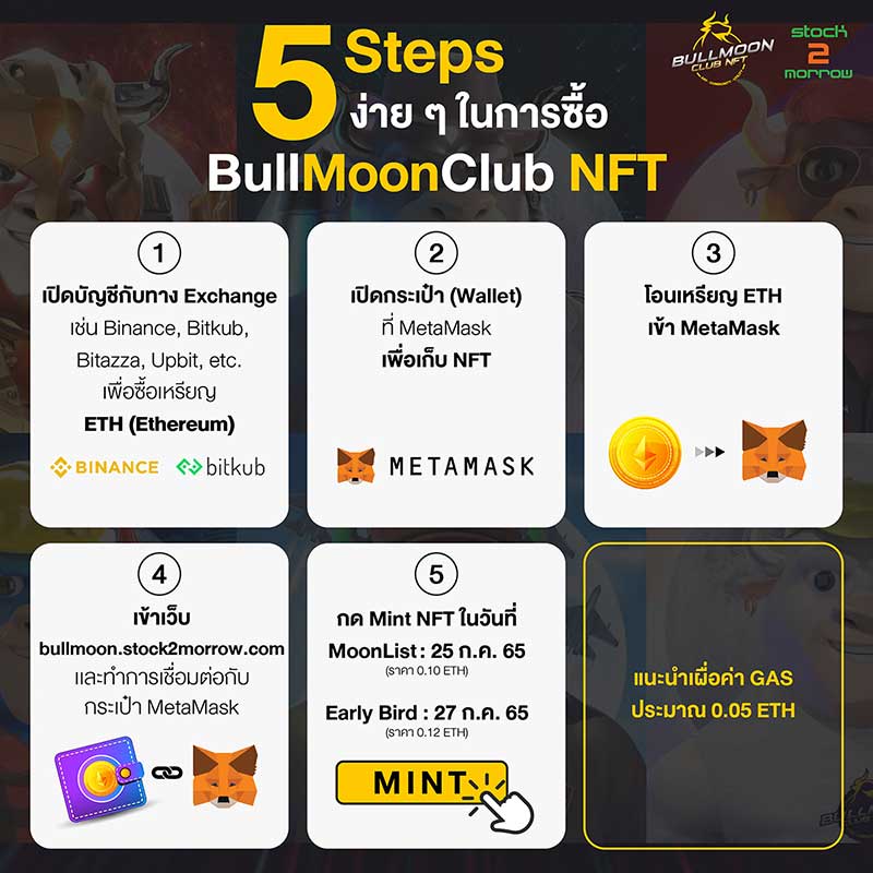 - กดซื้อ (Mint) BullMoonClub NFT โดยใช้เหรียญ ETH ในวันที่ 25 ก.ค.เวลา 10:19 น. : Moonlist (ราคา 0.10 ETH) และ 27 ก.ค. เวลา 10:19 น. : Early Bird (ราคา 0.12 ETH)