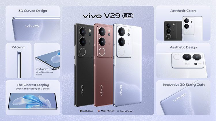 vivo V29 5G ลงตัวด้วยดีไซน์สุดหรูหรา งามสง่า โดยเฉพาะเฉดสีแดงเข้ม (Magic Maroon) ที่สะท้อนออร่าความมีระดับสะกดสายตาดั่งผืนผ้าไหมที่บรรจงถักทอไว้ ควรค่าแก่ผู้ที่ต้องการเแสวงหาสิ่งที่ดีที่สุด โดยเฉดสีแดงเข้ม (Magic Maroon) ผลิตด้วยกระจกฟลูออไรต์ AG ที่เปลี่ยนสีได้ไม่ซ้ำใคร และใช้เทคนิคการผลิตแบบ Photo Etching ระดับนาโน มาพร้อมลูกเล่นฝาหลังเปลี่ยนสีได้ เลียนแบบเลนส์โฟโตโคมิค (Photochromic Lens) ที่ค่อย ๆ เปลี่ยนสีจากใสเป็นเข้มขึ้นเมื่ออยู่กลางแจ้งเนื่องจากกระทบรังสี UV และเมื่อเล่นกับการไล่ระดับเฉดสีและแสงเงา ตัวเครื่องจึงให้สัมผัสที่ดูนุ่มนวล อัดแน่นด้วยคุณภาพระดับพรีเมียมในแบบที่ไม่เหมือนใคร
