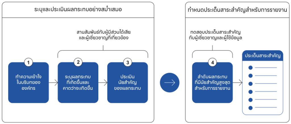 ต่อจากนั้นองค์กรจึงนำผลกระทบที่ถูกระบุมาจัดลำดับโดยเลือกชุดประเด็นที่มีนัยสำคัญสูงสุดเข้าสู่กระบวนการรายงาน ซึ่งในที่นี้ เรียกว่า การกำหนดประเด็นสาระสำคัญ (Material Topics) หรือสารัตถภาพสำหรับการรายงาน