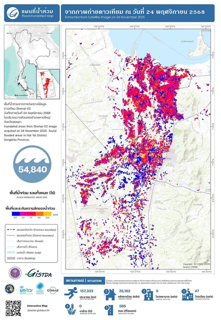 ในส่วนของข้อมูลเชิงวิชาการ สำนักงานพัฒนาเทคโนโลยีอวกาศและภูมิสารสนเทศ (GISTDA) ได้เปิดเผยภาพถ่ายจากดาวเทียม Sentinel-1A ซึ่งระบุตัวเลขพื้นที่น้ำท่วมขังล่าสุดกว่า 334,895 ไร่ ครอบคลุม 7 จังหวัดภาคใต้ ข้อมูลดังกล่าวถูกนำมาใช้ประเมินความรุนแรงของสถานการณ์และทิศทางของมวลน้ำ เพื่อประกอบการประกาศพื้นที่ภัยพิบัติและการวางแผนบริหารจัดการน้ำในระดับมหภาค