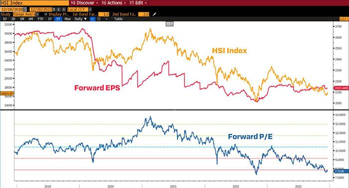 ประกอบกับการประเมินมูลค่าหลักทรัพย์ (Valuation) ที่สะท้อนภาพรวมตลาดหุ้นจีน-ฮ่องกง ได้แก่ ดัชนี Hang Seng ประกอบด้วย บริษัทยักษ์ใหญ่ของจีนและฮ่องกงที่จดทะเบียนในตลาดหุ้นฮ่องกงจำนวน 80 ตัว เช่น Tencent, Alibaba, Meituan, AIA ปัจจุบันมีค่า Forward P/E อยู่ที่ 7.72 เท่า ซึ่งอยู่ในระดับที่ถูกเมื่อเทียบกับ Fair Value (ค่าเฉลี่ย P/E ย้อนหลัง 5 ปี) ที่อยู่ 10.50 เท่า รวมทั้ง Forward EPS หรือ กำไรต่อหุ้น คาดการณ์ในอนาคตได้ผ่านจุดต่ำสุดมาแล้ว และมีแนวโน้มปรับตัวเพิ่มขึ้นเรื่อย ๆ