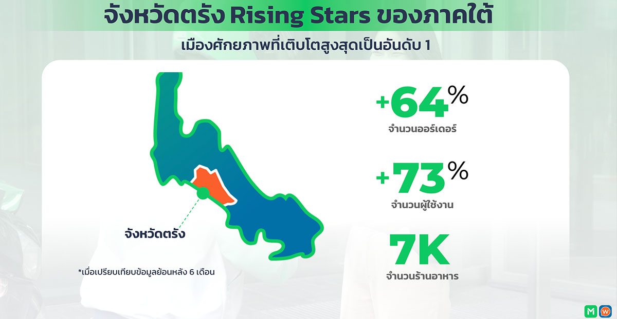 ภาคใต้เป็นภูมิภาคที่มีศักยภาพในการเติบโตสูง มีมูลค่าธุรกรรมรวม (GMV) โต 38%* จังหวัดที่มีอัตราเติบโตสูงสุดในภาค ได้แก่ ตรังและกระบี่