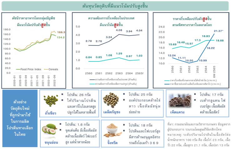 2. ความเสี่ยงจากต้นทุนการผลิตที่เพิ่มสูงขึ้น: วัตถุดิบหลักในการผลิตโปรตีนทางเลือกของไทย ส่วนใหญ่ยังมาจากถั่วเหลือง และไทยยังพึ่งพาการนำเข้าถั่วเหลืองในสัดส่วนที่สูง ดังนั้น ภายใต้สถานการณ์ราคาธัญพืชโลก ราคาพลังงานและค่าขนส่งที่ยังมีแนวโน้มขยับขึ้นได้อีกในช่วงที่เหลือของปี 2565 อาจทำให้ธุรกิจมีภาระต้นทุนที่ขยับสูงขึ้น ทั้งนี้ ในระยะข้างหน้าการพัฒนาวัตถุดิบทางเลือกน่าจะเข้ามามีบทบาทมากขึ้น ซึ่งการเลือกใช้วัตถุดิบใดๆ คงต้องคำนึงถึงต้นน้ำหรือระบบการผลิตที่ต้องมีความมั่นคงเพียงพอในระยะยาวและอาจคำนึงถึงวัตถุดิบท้องถิ่นที่เป็นอัตลักษณ์เพื่อสร้างความแตกต่างควบคู่ไปด้วย