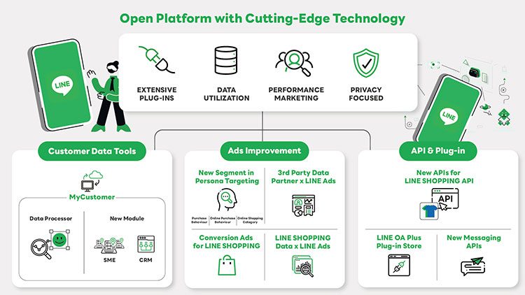 - API & Plug-In เปิดขยายการเชื่อมต่อ API ให้มีความหลากหลายและตอบโจทย์เฉพาะด้านได้อย่างครอบคลุมขึ้น อาทิ LINE SHOPPING API, Messaging API รวมถึงแผนการเปิดตัว LINEOA Plus Plug-in Store แหล่งรวมโซลูชั่นสำหรับนักพัฒนานอกองค์กร LINE ในการนำเสนอโซลูชันใหม่ ๆ และยังเป็นโอกาสสำหรับภาคธุรกิจไทย ในการมองหาโซลูชั่นให้ตรงกับความต้องการ