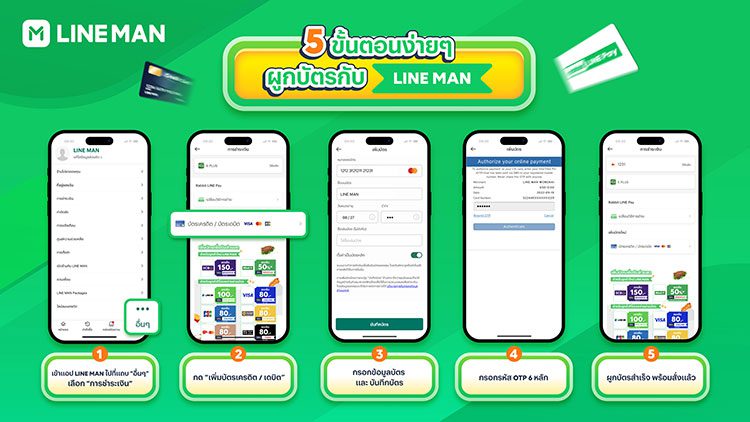 ลูกค้าสามารถผูกบัตรเครดิตเข้าร่วมแคมเปญ “LINE MAN ตัดบัตรได้แล้วทุกร้าน” ได้ง่าย ๆ เพียงเข้าไปที่หน้าแอปพลิเคชัน LINE MAN เลือกเมนู “อื่นๆ” จากนั้นเลือก “การชำระเงิน” และกด “เพิ่มบัตรใหม่” เพียงเท่านี้ก็สามารถผูกบัตรได้ง่าย ๆ แล้วสั่ง LINE MAN ได้ทุกวันทุกเวลาแบบคุ้ม ๆ สั่งได้เลยที่ https://lineman.onelink.me/1N3T/egw5elza